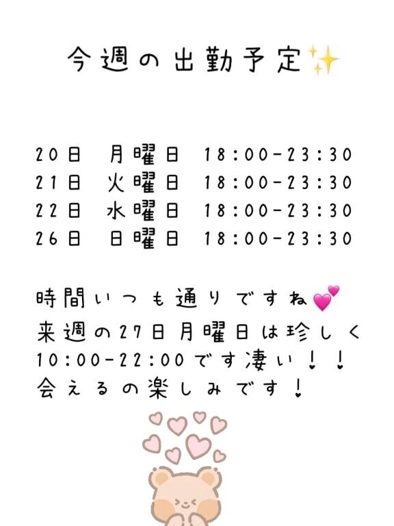 時間は変わらずですがなんと4日もいます奇跡〜✨️✨️体調100億%バッチリですのでおまかせあれです〜!!来週は珍しく昼間いるので絶対来て欲しい🥲今週もよろしくお願いします♥️