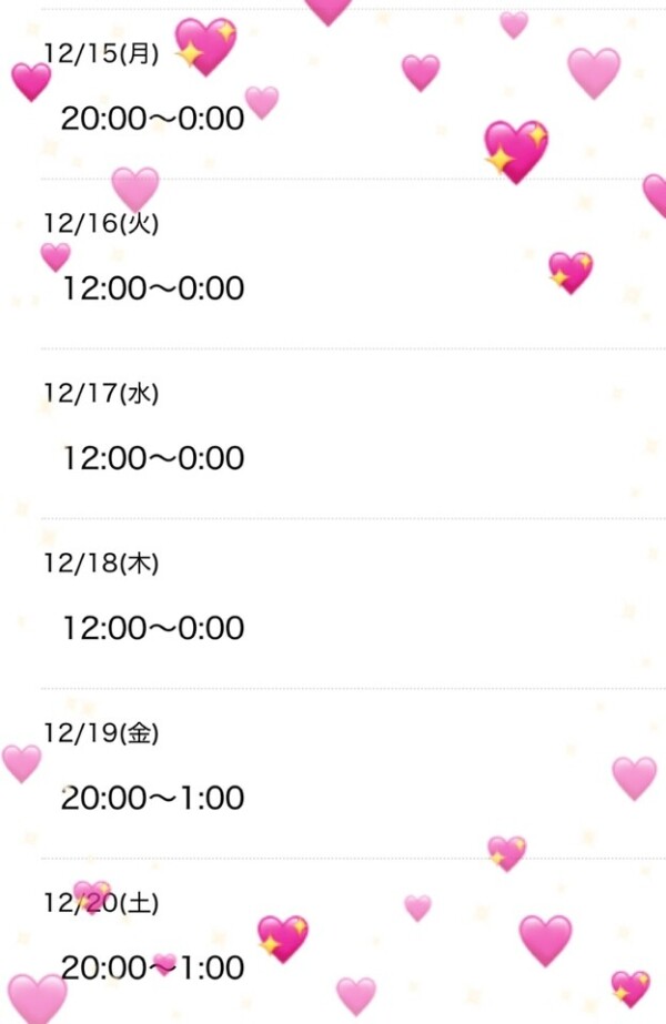 12時〜の出勤予定でしたが、急用が出来てしまい20時〜1時の出勤に変更させて頂きます🥲