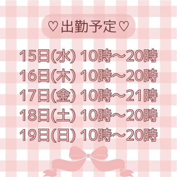 今週の出勤予定ものせときます!!もし時間外でこの時間行けないかな?って時間あればトークとかで聞いてください??もちろん日によるけど出勤時間伸ばしたりもできるかも!今週も変態紳士の皆様と刺激的なプレイができるのを楽しみにしてまってます?