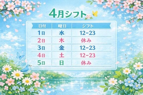 今週シフトはこんな感じどす?春の舐め活?遊びに来てね?