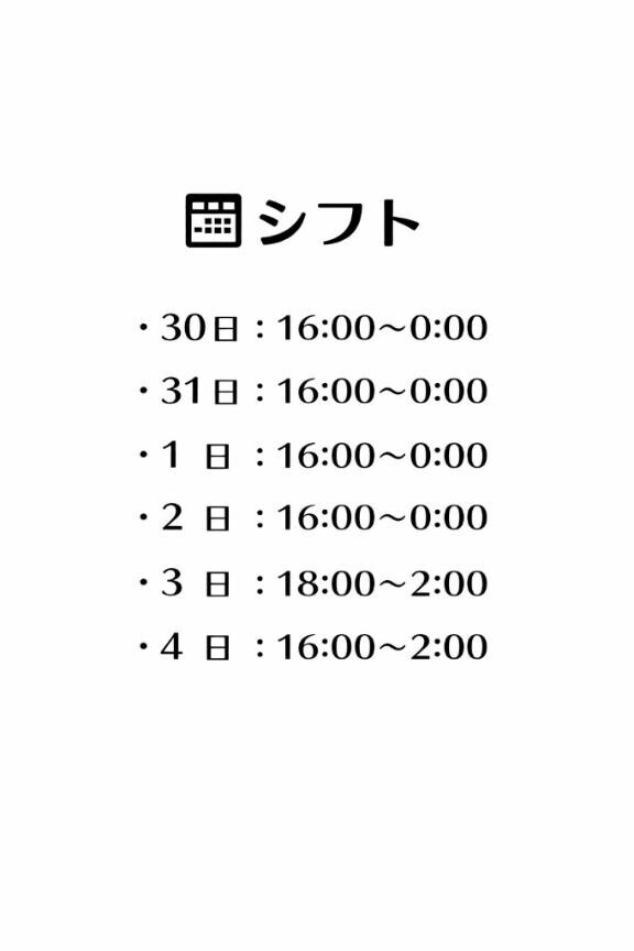 本日出勤 16:00〜翌00:00