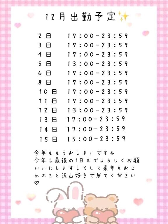 遅くなってごめんなさい!!!来月の予定です✨️少ないですが13時から来れる日があります!とはいえほとんど17時からです!お兄さんに会えるチャンス逃したくないからなるべく沢山出勤します!!来月もよろしくお願いいたします😘