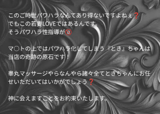 こんばんは。ときです。お店からの紹介文を見てみると…(ワクワク)…パワハラ?笑でもね、実は私、このお仕事でずっと大事にしていることがあります。それは嫌なことはしないということ。じゃあ、どうしてパワハラなのかな?って少し考えてみて、あぁ、そういうことかもしれないって。たぶんそれは、立てなくなったり、頭が真っ白になるくらい気持ちよくなったり、「いきたいのに、いきたくない」そんなふうに葛藤したり。理性より先に、身体だけが正直になる瞬間。それを性のパワハラって呼ぶなら、たぶん私は、得意です?ちゃんと嫌なことはしない。でも、「全部見せてもいいかも」。M男くん、その矛盾、味わってみませんか??