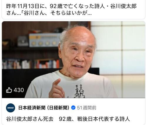 昨年の今日、偉大な詩人の谷川俊太郎が亡くなりました。私の大好きな詩人でした。特に「生きる」という詩が好きです (色々な人がメロディを付けています)一見簡単な言葉で子どもにも分かりやすい詩なんだけど、大人にはそれが胸の奥を突く深い詩。沁みるんだなぁ… 直接お会いしたことはないけれど、きっと純粋な人だったんだろうなぁと思います 世界ではまだまだ戦いが起きていて混沌とした世の中、自分自身も忙しい毎日だけど、時々立ち止まって、自分の中の「純粋な部分」を確かめるように詩集を手に取ったりします 今日はテレビやラジオ、そして都内や横浜などで色々な「谷川俊太郎イベント」が行われています。私もしっかり参加 作曲家でありピアニストでもある息子の谷川賢作さんも今日はあちこち関連イベントに呼ばれて忙しそうです 今日はそんな日。エロくなくてごめんなさい