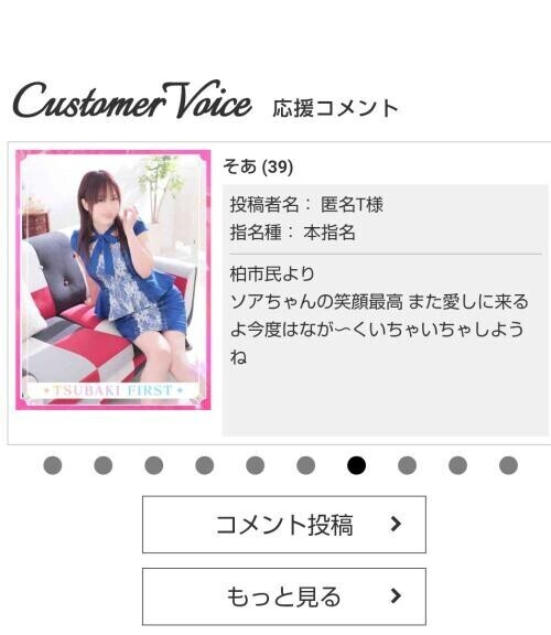 | お店よりコメント | 『若すぎて可愛いだけの子は好みじゃない』 『人妻店や熟女店だけでは年齢がいきすぎている』 と感じている男性は多いのでしょうか? TSUBAKI FIRSTはそのようなお客様のための 『若妻・若まま・お姉さん』専門の ファッションヘルスとなっております。 |
