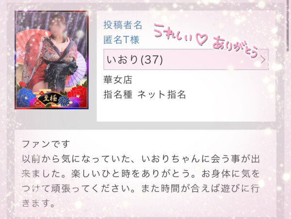 初リピ様&仲良し様方、いおりのお相手ありがとうございました❣️寒い中お時間作って遊びに来てくださり感謝しかないし、会えて嬉しいー✨