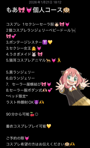 今日もお兄様方ご来店ありがとうございます明日は事前予約のお兄様と会えるのもあ楽しみです??明日も特別コース??個人イベント??開催します??お楽しみに?癒しをお届けしますね事前予約も待ってます??70分~アイマスク?90分~コスプレコース入浴剤プレゼントこの後は片付けしてゆっくりします寝る前にアニメと湯船入りながら??また明日おやすみもあ??