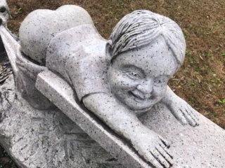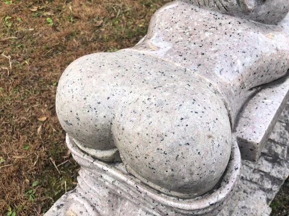 プリップリのおしりを出している男の子の石像付きのベンチです。
