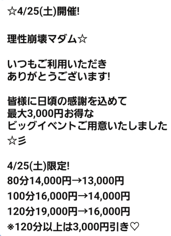 今日はなんとなんと円割り引きの最大のイベント開催日です女の子もスタッフさんも張り切ってエロお兄様を オ モ テ ナ シ 致します沢山のお誘いをお待ちしていますハピハピな日になりますように