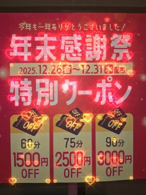 今年最後のイベントのお知らせだよ 12/26(金)~12/31(水)の間は、お得なクーポンが貰えるよ ご来店お待ちしております。