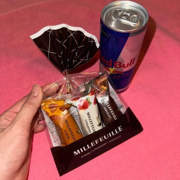かわいいチョコとレットブル~???甘いのも元気でるのも知っててくれてにこにこです( *´?`*)?のあの為に選んでくれてありがとう?ご馳走様でした?