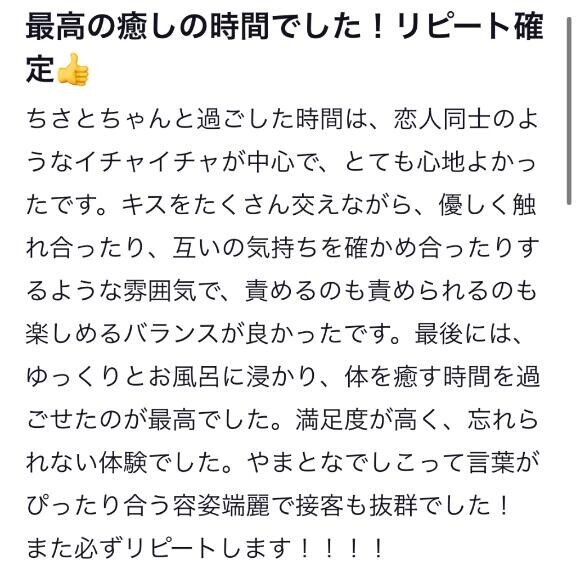 龍5105様?嬉しいです??全然やまとなでしこじゃないよ~?たくさん笑っていちゃいちゃもして楽しい思い出になったね??とっても嬉しい口コミありがとう??