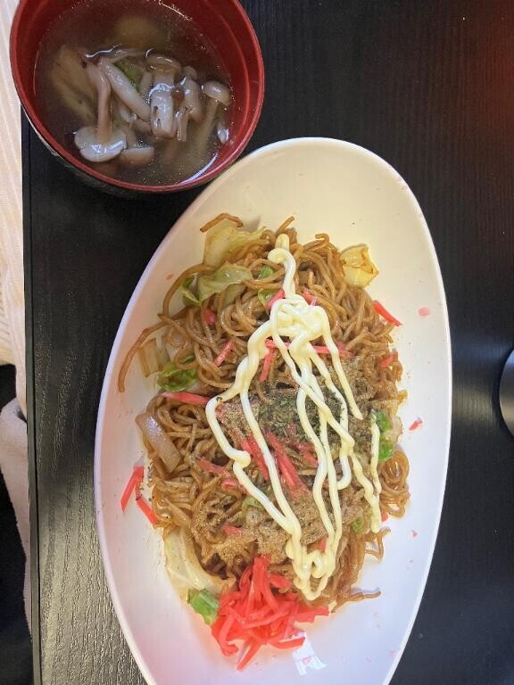 焼きそばとしめじのコンソメスープ
