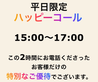 完全申告制なので、ご予約受付時に、「ハッピーコールのイベントで」と、お伝えください。