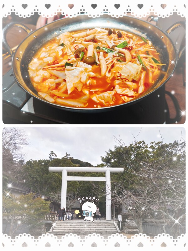 写真は安房神社とモツ鍋(チゲ味)です☺️