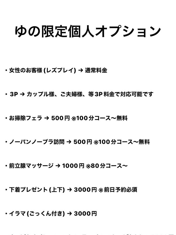 ディープキス, 指入れ, 素股, 全身リップ, 生フェラ, 玉舐め, 69, 口内発射, パンティー持ち帰り, ストッキング, アイマスク, オナニー, ローター, バイブ, 電マ, 手コキ, マッサージ, パイズリ, アナル舐め, 即尺, 顔射, ゴックン, 聖水, 3P, 乳首舐め