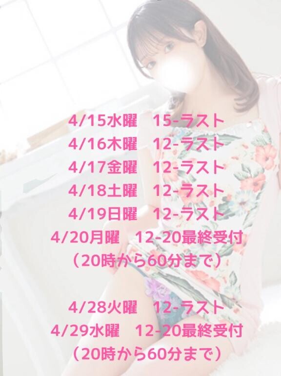 本日もありがとうございました?受付ギリギリでお写真からも選んでもらえて嬉しかったですラブレターはお休み中書くので少し待っててね!お休み中予定詰め込みすぎてバタバタだわ笑取り急ぎ、今後の予定です。画像参照お休み明けは頑張って6連勤する予定笑体調不良や電車運休とか以外は、何か余程のことがない限り当日欠勤しないタイプなのでそこは安心してね?