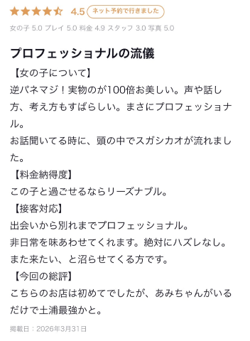ヒソヒソさん口コミありがとう?優しい言葉に元気もらったよ~??数あるお店、数ある女の子の中からおち◯ぽの直感を信じて勇気を出して選んで会いに来てくれたってことだから…??だからこそ日常から抜け出してあみとの非日常に心まで蕩けてイって欲しい…一期一会を大切に???そんなささやかな気持ちがお兄さんに届いてよかった????素敵なお兄さんに実物のほうがいいって言われると照れちゃうね///また土浦に立ち寄った時はよろしくね????