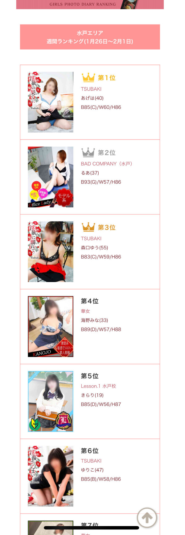 店内2位、水戸エリア3位でした。ありがとうございました。ところで目の前の煌びやかなソープ、1/30に突然閉店したんですね。ビックリ。全国系列店ソープ一斉閉店って、何があったん?まだ1年ぐらいしか営業してないよね?水戸店は総工費10億円よ それを捨ててまで……。突然解雇になったスタッフや女の子は……ひょっとしたら年増の人はツバキに流れてくるかもしれませんね (ソープとヘルスは違うからそれはないか )
