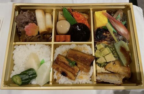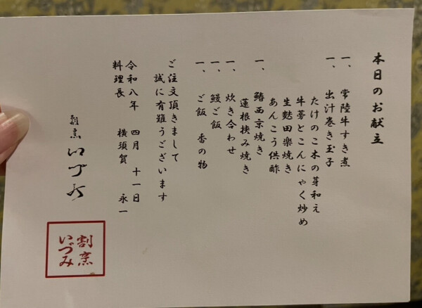 ようやくお弁当タイム 包みを開いたらナントお品書きが!丁寧!そして彩りも豊かでめっちゃ美味しそう さすが高級料亭!