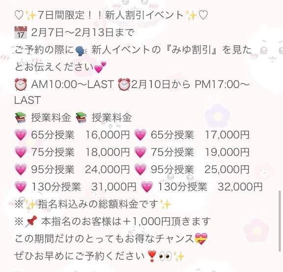 みゆの新人割13日まで使えますのでこの機会にぜひ!!?(※新人割使える時間帯決まってるので気をつけてください!)ちょっとお得にみゆと遊べるよ??まだ枠?ありますがご予約早い者勝ちなのでお早めにー!萌萌オプション無料ですのでたっぷり愛注ぎにきてください?