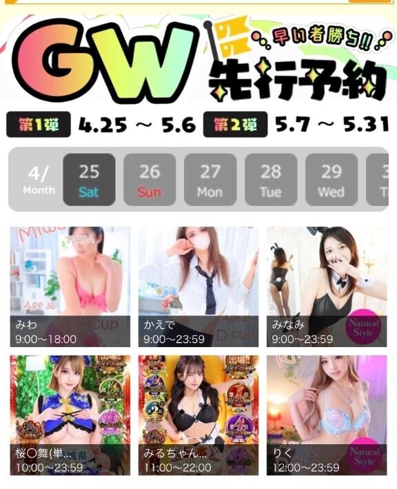 お店HPにより、GW先行予約を受付中です??♀??沢山のご予約お待ちしております??今年のGWは最大12連休とか∑(゚Д゚)スゲェこれはTIARAに行くしかないでしょう?wTIARAには素敵な女の子達が揃っておりますので、早く予約しないと埋まっちゃうかも???まだ出勤予定が出てない女の子もいらっしゃると思うので、随時HPチェックを???早い者勝ちですよ????急げ~????