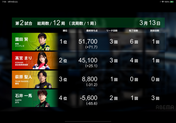 昨日は赤坂ドリブンズのソノケンこと園田賢プロが東場の親で6千オールを決めてそのままトップへ
