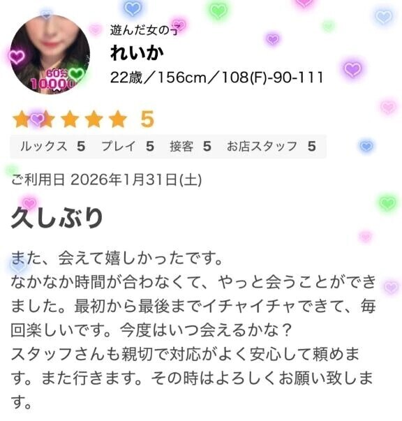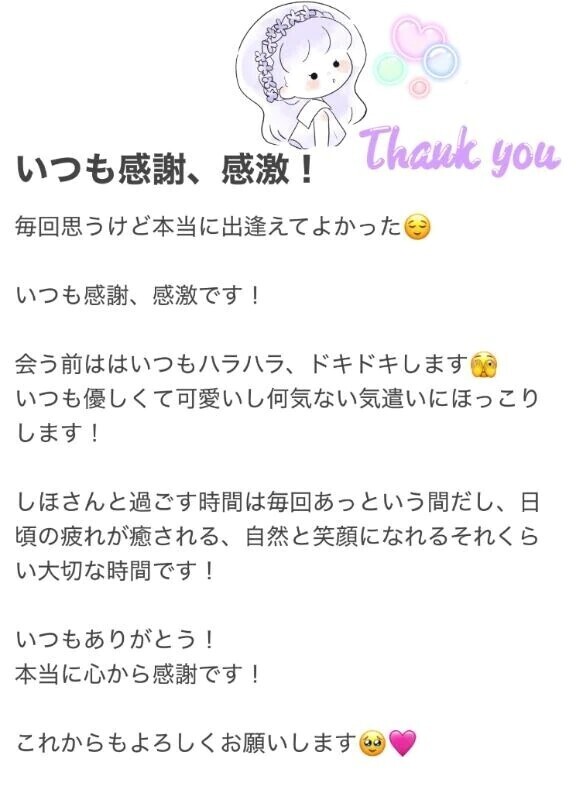 素敵な口コミありがとうございます(୨୧ ❛ᴗ❛)✨️感謝、感激🙏しほも同じこと思ってるよ😚ありがとう❣️いつもハラハラ、ドキドキしてるよね~💓でも、この気持ちって大事だよね☺️これからもたくさん癒します🫶遠慮しないでたくさん甘えてね💕しほ🦋💜 ◆-+-+-+-+-+-+-+-+-+-+-+-+-+-+-+-+-+-+-+-+-+-+-+-+-+-+-+-◆ 茨城水戸ちゃんこ 受付営業時間12時〜0時 TEL:050-5211-4645 メルマガ会員はコースに10分無料追加!!(2,000円お得) 口コミを書くと次回2,000円引き(60分コースは1,000円引き) 併用可能なので最大4,000円割引が何度でも可能!! 詳しくはお電話にてお待ちしております。 ◆-+-+-+-+-+-+-+-+-+-+-+-+-+-+-+-+-+-+-+-+-+-+-+-+-+-+-+-◆