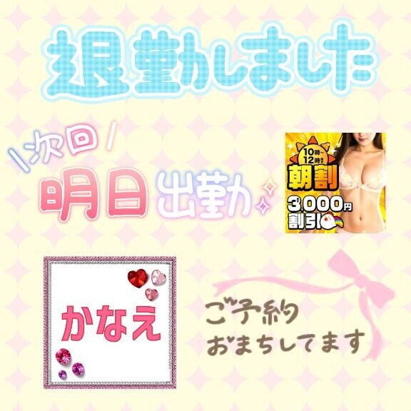 本日、パネル撮り直しまして〜新しくなる予定ですパネル更新されたらCHECKお願いいたします明日は…ロング出勤です🩷🩷🩷ご予約状況は…オープン〜13:30くらいまで14:00-15:2015:30-20:00までとなってますマイガール登録からよろしくです🩷🩷🩷かなえ