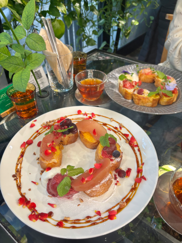 頼んだメニューは、母は「花かんむりのフレンチトースト+ボラボラ(紅茶)」ひなみは「季節の花かんむりフレンチトースト+旅する紅茶」
