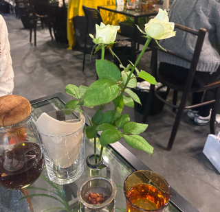 テーブルの両脇には2輪の綺麗な白い薔薇が刺さっていました???