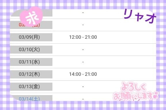 来週は日㈪:〜:あがり日㈭:〜:あがり出勤しま〜すスタート時間が違うのでちょっと注意してくださいイチャイチャしましょご予約お誘いよろしくお願いしま〜す3月後半の出勤日が決まってるようで決まってないので決まり次第日記にアップしま〜す