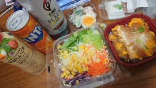 こんにちは昼職の休憩中今日はミニカツ丼生野菜サラダブロッコリーとエビとゆでたまご喉が渇いてたのでファンタオレンジも買っちゃいました今日もちょっとヒマなほうでのスタートだったけど途中混みましたふぅ〜