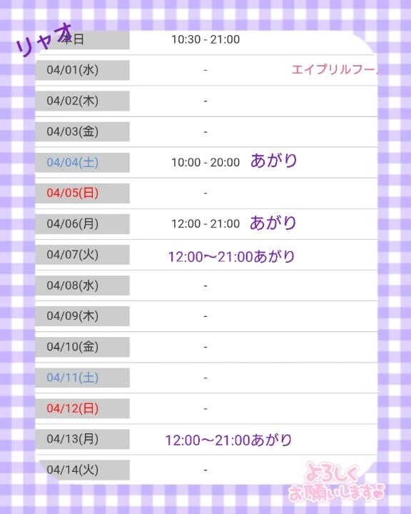 明日から月ですね新年度の始まりですさてリャオも月前半の出勤日が決まりました日㈯:〜:あがり日㈪日㈫日㈪:〜:あがり前半はこの4日間、出勤しますリャオとイチャイチャする時間を作ってねよろしくお願いしま〜すあ今日のお誘いもまだまだ受付中〜