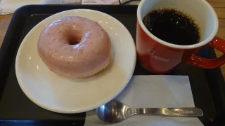 いつものコーヒータイム中いつものホットコーヒーストロベリーリング🍩みなさまはドーナツなにが好きなのかなぁ。。。