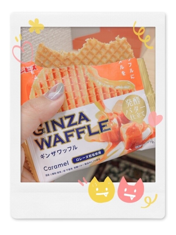 写真のワッフル、柔らかめのクッキー生地と間に挟まれたキャラメルクリームがめっちゃ美味しくてサイコーだったよ!