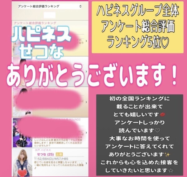 | お店よりコメント | 2024年4月10日再始動!ハピネスグループの総力を集結!内装、女の子のおもてなし、館内設備、当グループの中でもワンランク上のお時間を過ごせるソープランドでございます! |