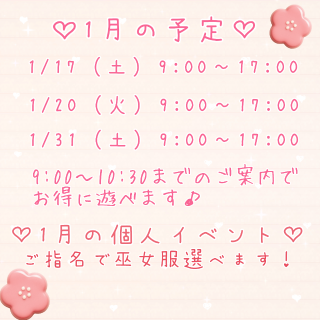 とわです1月後半の予定です個人イベントとしてご指名のお兄さまは通常OL制服か巫女服選べますので、新年のご挨拶をさせてくださいもちろん初めましてでも、指名してくださっているなら選べますのでこれからよろしくお願いしますもお待ちしてますさっそく事前予約してくださってるお兄さまありがとうございます嬉しいです
