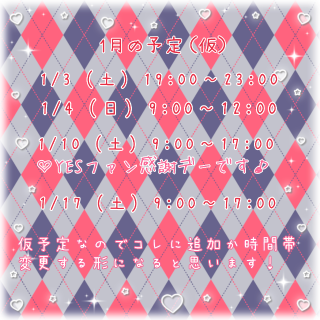 とわです1月の予定更新しておりますっ追加や時間帯変更あると思いますが、現時点ではこの日は確実にいると思われます12月のサンタコスは間に合わなかったので、1月は何かやろうかと思ったり思わなかったり…?お楽しみに