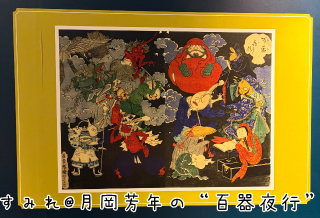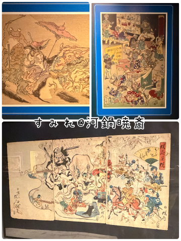 躍動感やスピード感のある絵の構図が特徴的です。幕府による厳しい言論統制が強まる中、妖怪たちを駆使して当時の政治や社会にメッセージを投げかけたようです。