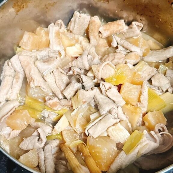 ご近所さんに、買いすぎたからあげると白モツをいただいたので、モツ、ねぎ、大根のシンプルなもつ煮作りました👀