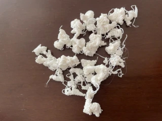 一晩中動いてた3Dプリンタがやっと仕事終えた!さーておもちゃ開発できるかな😍??可愛いポップコーンみたいなクズ🍿