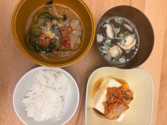 ロールキャベツと,キムチの冷奴