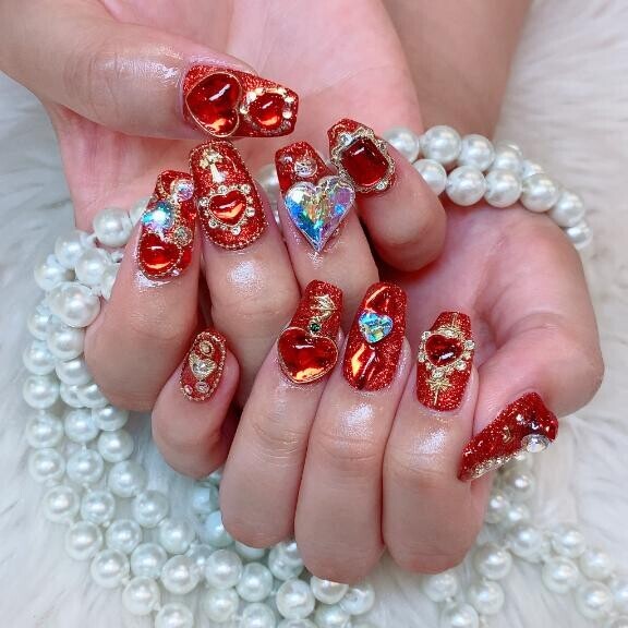 お題:お気に入りのネイルの写真を見せてくださいに回答♪ゴテゴテが好きだけど、最近はシンプルめにしてる。理由はゴテゴテだと値段が高いから?写真のネイルは自爪で18000した?ネイル辞めたいとすら思ってる?でも可愛い爪だと気分がいいのでなかなか辞められないよねぇ~スズ