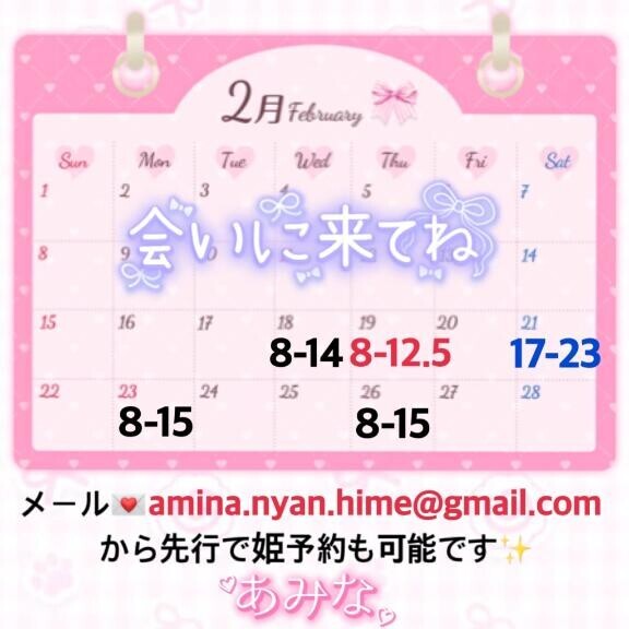 あみなです??2月のシフト予定変更になり後半シフト少し追加になりました??画像にシフトまとめてるのでご都合合う日ありましたらぜひお誘いおまちしてます???早番が多いですが、21日の土曜日だけ遅番でいます??♀?よかったら事前のご予約もおまちしてます???来月はあんまり出勤できなそうなので今月いっぱいお誘い頂けたら嬉しいです???あみな?