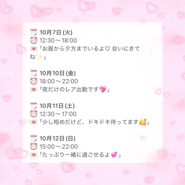 次の出勤は10月7日 12:30~18:00です💝
