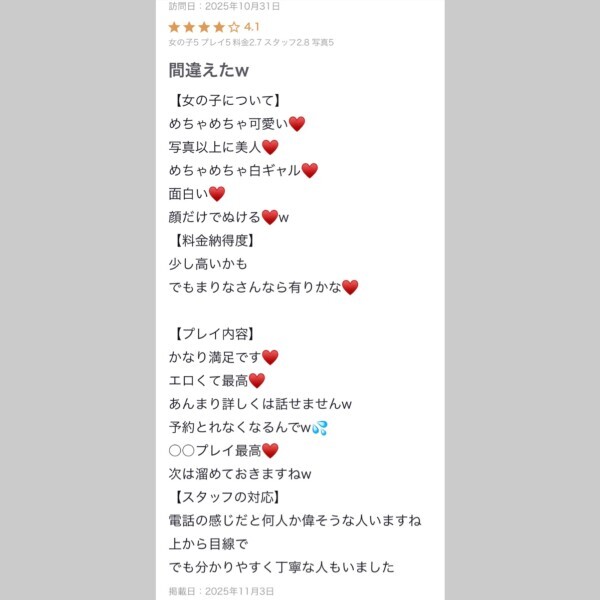 [ ルックス 5 / プレイ内容 5 / トーク 5 / サービス 5 ]