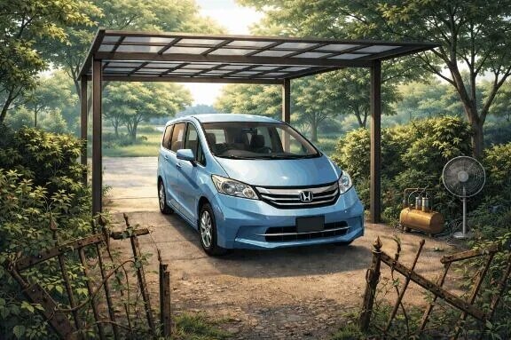 chatGPTに『水色のホンダフリードの屋外カーポート書いて、古びた壊れかけの門扉もつけて』って言ったらこうなった🤣頼み方下手🤣