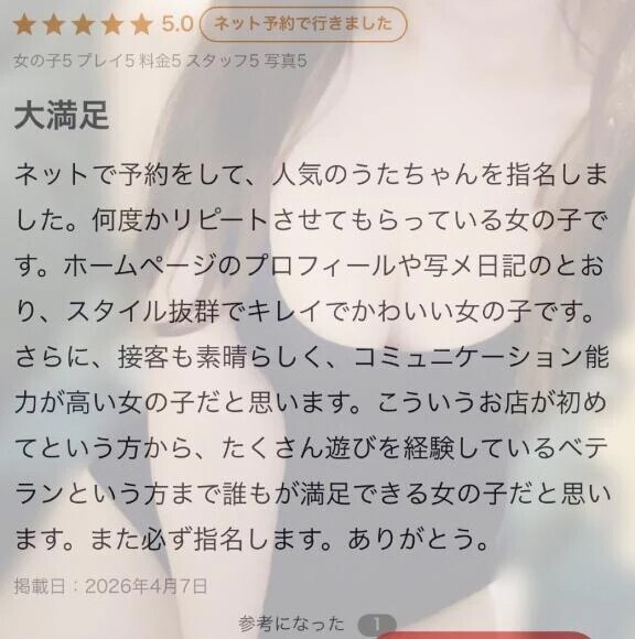 ˚˙༓࿇༓˙˚˙༓࿇༓˙˚˙༓࿇༓˙˚˚˙༓࿇༓˙˚˙༓࿇༓˙˚˙༓࿇༓˙˚💌kmgeaさん💌今回も口コミ書いてくれてありがとーう!!!何度も会いにきてくれて本当に嬉しい💕💕「スタイル抜群で可愛い」「コミュニケーション能力が高い」「初心者さんからベテランさんまで満足できる」と言っていただけて、胸がいっぱいだよ😖✨また遊ぼうね❣️うた˚˙༓࿇༓˙˚˙༓࿇༓˙˚˙༓࿇༓˙˚˚˙༓࿇༓˙˚˙༓࿇༓˙˚˙༓࿇༓˙˚