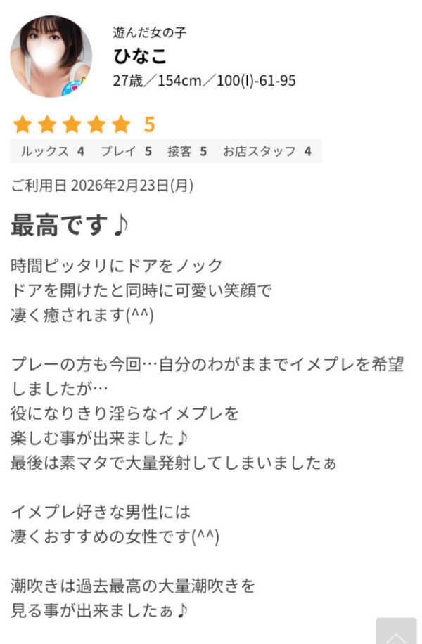 素敵な口コミありがとうございます❣️たくさん褒めて頂き嬉しいです✨好評までしてもらい大量潮吹〇とイメプレ喜んで頂き本当に嬉しいです💕🙏とても励みになります🩷これからも日々精進してどんどん成長してまだ見ぬ快楽に浸ってもらえるように頑張ります🔥💪